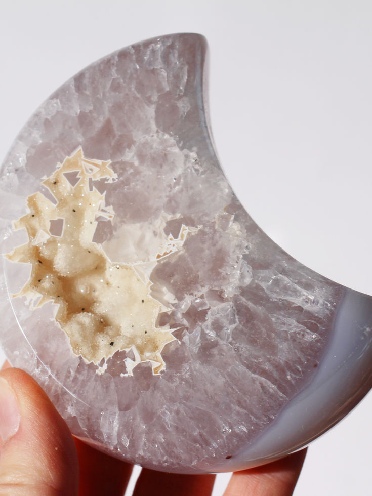 Ein Mond aus Achat mit einer Quartz-Geode.