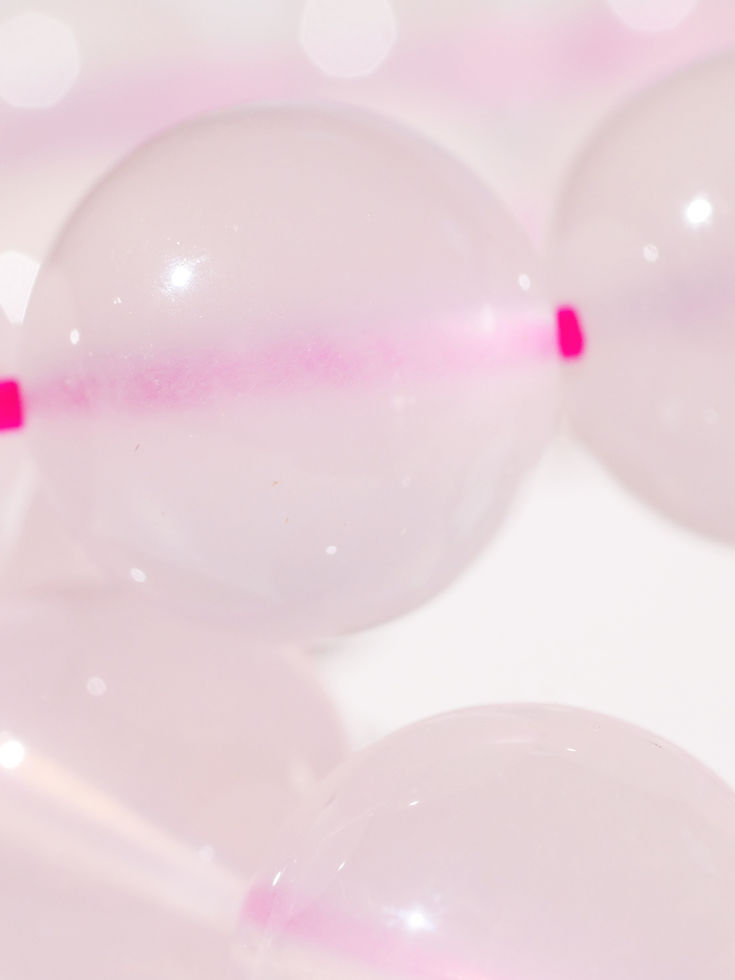 Ein Armband aus Rosenquartz-Perlen mit vereinzelten Amphibol-Einschlüssen (11-12 mm). AKA Schneeflocken-Rosenquartz.