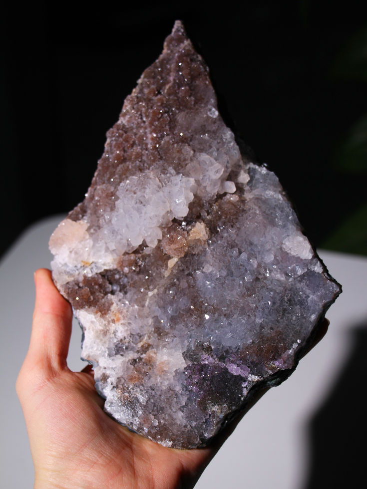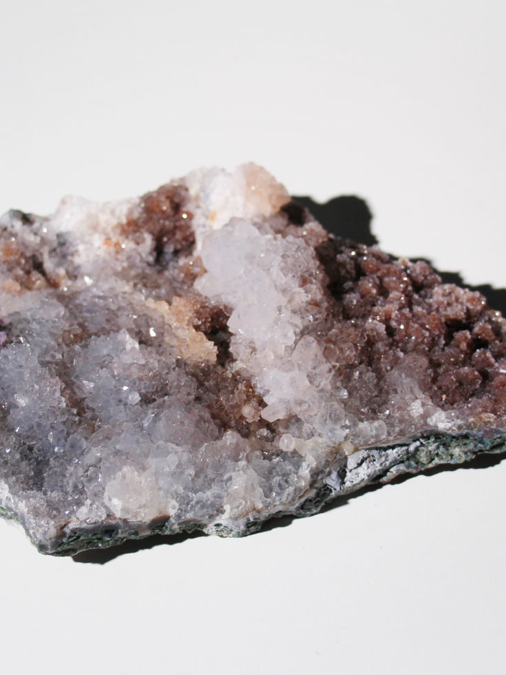 Eine Stufe aus verschiedenen Quartz-Kristallen, mit Amethyst, Bergkristall und Prasiolith. Mit Fluorit und Calcit. Aus Bahia, Brasilien.