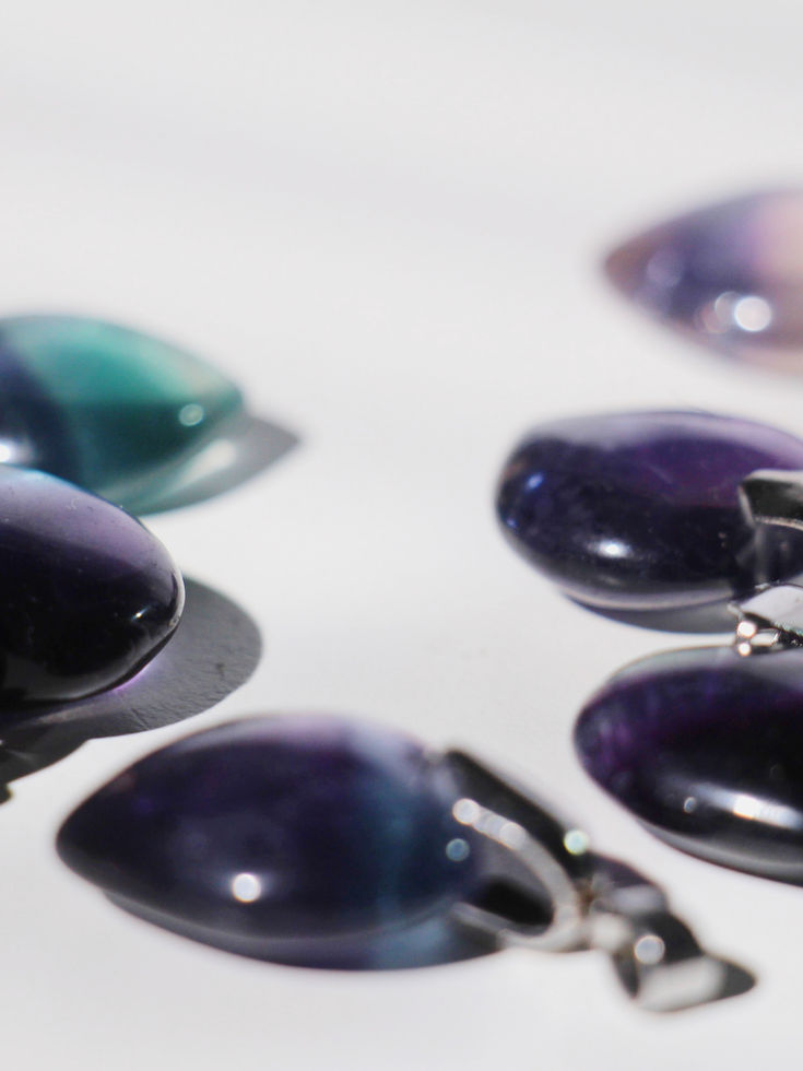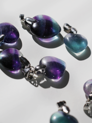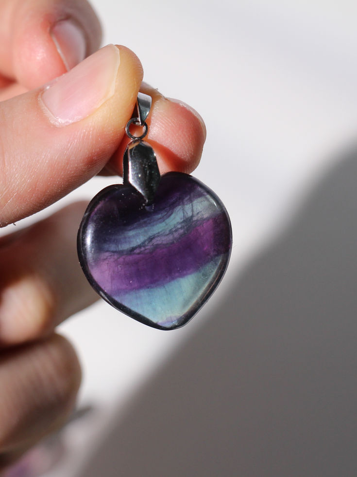 Kleine Anhänger aus Fluorit in Herzform. Der Anhänger besteht aus Stahl.
