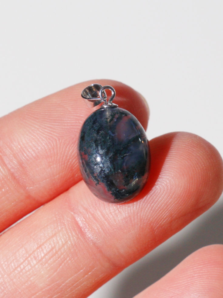 Ein kleiner Anhänger aus Moosachat mit einer Öse aus Vollsilber S925.