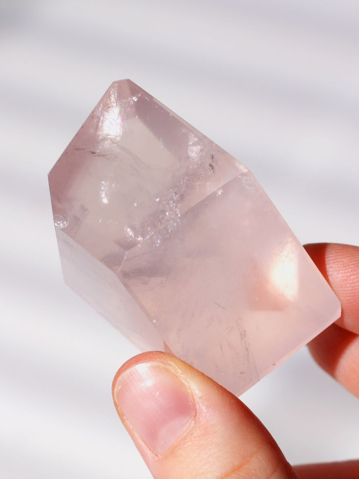 Eine Freiform aus Rosenquartz. Mit kleinem Regenbogen.